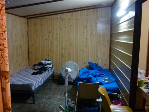 中はというと、潔癖症でファーム初心者の僕にはとても住めたもんじゃなかったです。ゴキブリよりも、ネズミの出現率がひどくて、中は穴が多数。狭い室内にテーブル、イス、コンロ、シンク、棚、冷蔵庫。ベッドは両サイドに2段ずつ。一人がやっと寝れるスペース。身長175の僕でも、頭と足が若干、壁に着いてしまう狭さw上のベッドでは柵もないので、落ちそうで恐かったです。布団は何度か落としました。